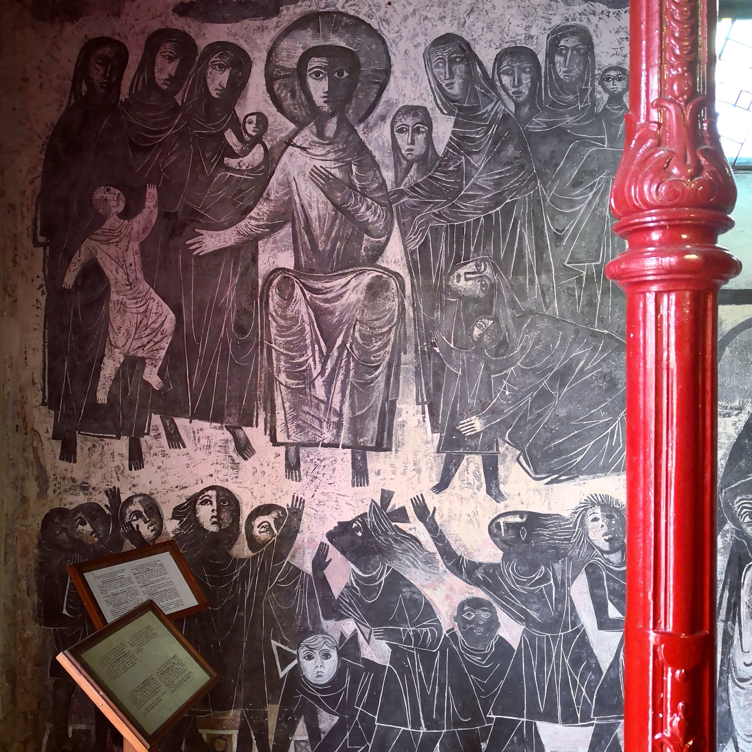 In het centrum van het dorp werden grote grachten geplaats in beton om een toekomstige overstroming te vermijden. Ik wandel richting het kerkhof, een doodlopende weg. Ik stap er binnen. Ik heb altijd een aantrekking had tot kerkhoven, een plaats waar ik graag in verdwaal. Er staat een prachtige kapel. Binnenin zijn prachtige mozaïeken te zien ‘La danses macabres’ gebouwd in 1932. Een verdoken pareltje.