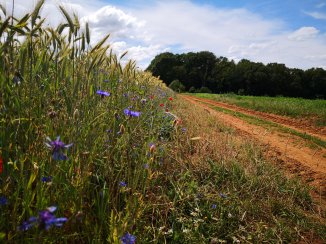 Ik geniet van de Open velden, De graanvelden, de natuur elementen. De geur van de bramen die vrijkomen door de zon die erop schijnt. Langs de weg talrijke wilde aardbeien. Ook al is het verleidelijk, ik laat ze staan. Omwille van de ‘vossenziekte’. Eén keer is genoeg.